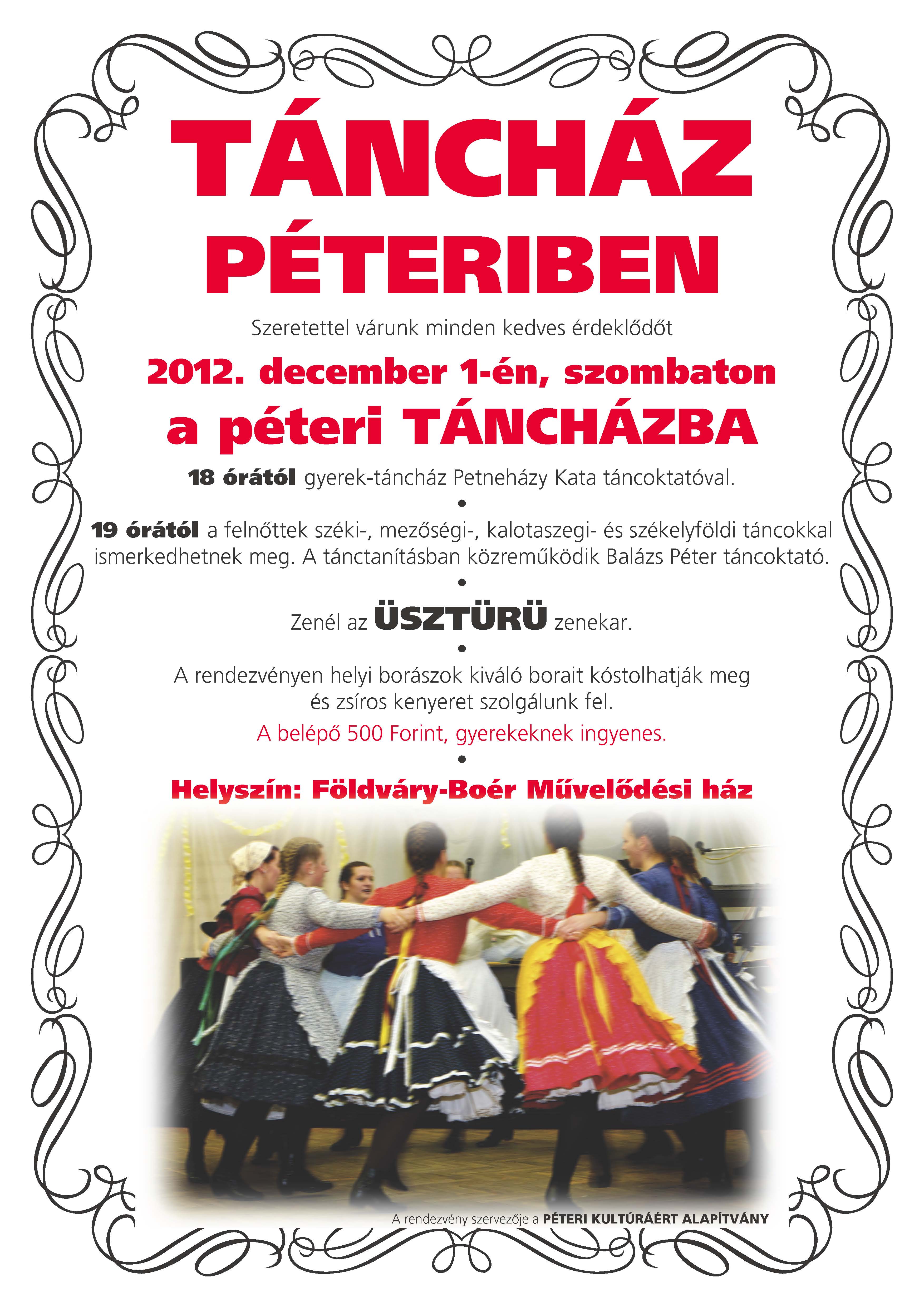 A Péteri Kultúráért Alapítvány 2012. december 1-én szervezi meg soron következő táncházát, amelyre minden érdeklődőt szeretettel várnak.