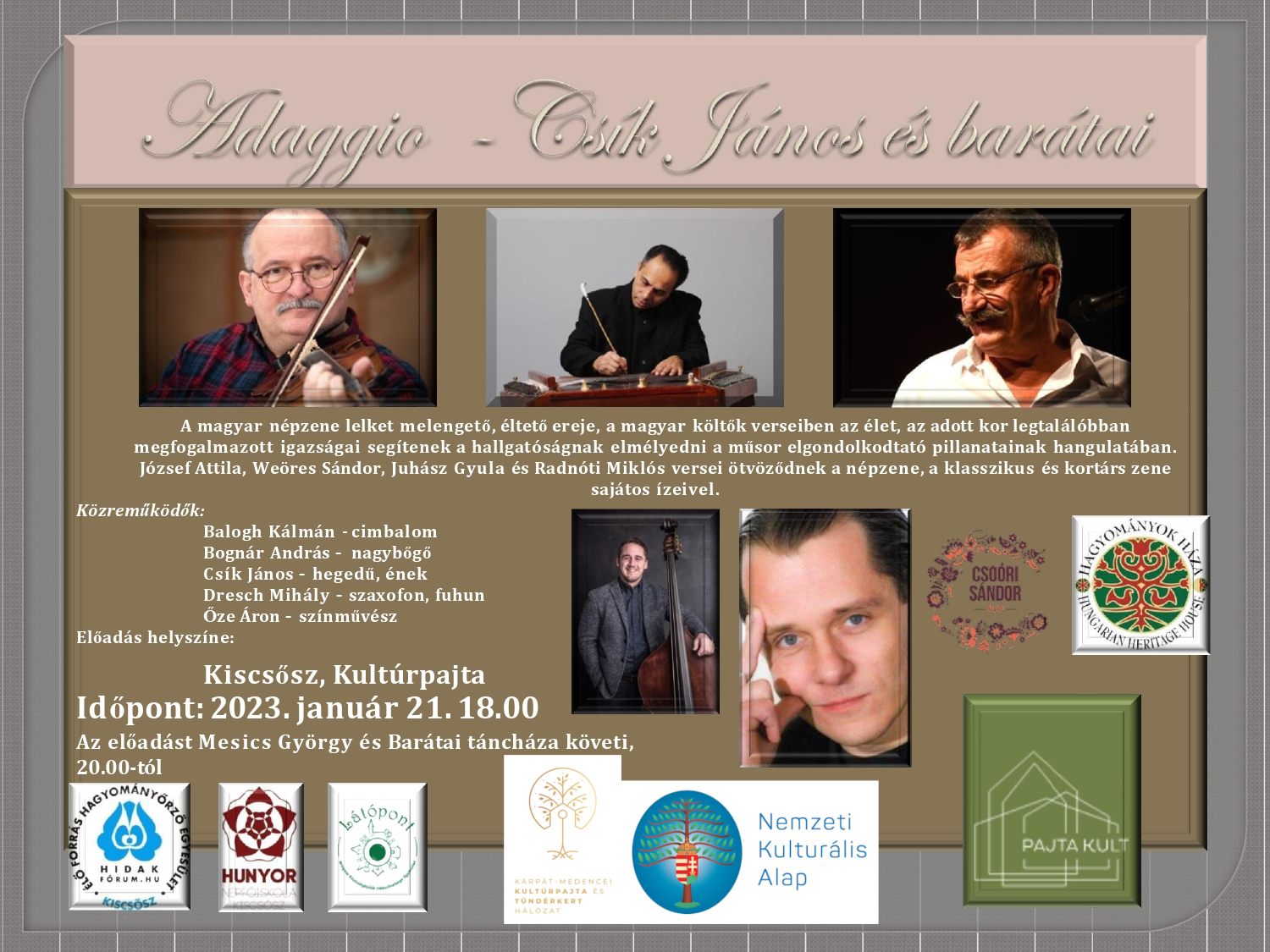 A Magyar Kultúra napja kapcsán, január 21-én, szombaton, 18.00 órai kezdettel, az Adaggio című zenés, verses gálára kerül sor, melyet Csík János, Dresh Mihály, Balogh Kálmán, Bognár András és Őze Áron adnak elő.
