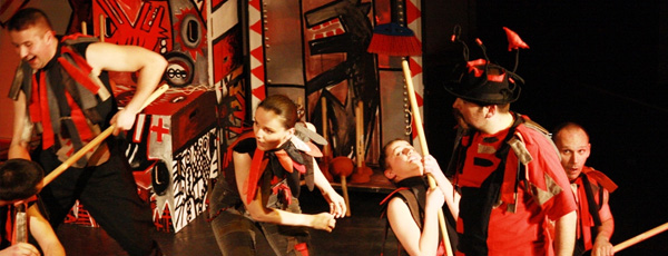 A ritmikai játékok pedig hiába emlékeztettek a magyar népzene zsigerileg kódolt ütemeire, egyértelműen egzotikus íze lett a dolognak, ahogy a pokol inkább kópés, mint gonosz ördögfiókái seprűnyelekkel és gumiharangos lefolyópumpákkal jártak táncot és játszottak virtuóz zenét egyszerre. Az előadáshoz készült műsorfüzetből egyébként az is kiderül, hogy a Bambuc ördög a Tamási írói világára rímelő sóvidéki ropogós táncok mellett dél-afrikai táncos és énekes hagyományokból is építkezik. A gumboot elnevezésű „táncot” a Dél-afrikai Köztársaság fekete bányászai járták, akiknek az apartheid rendszer megtiltotta a hagyományos dobolást – így gumicsizmájuk ritmikus dobbantásával üzentek egymásnak.