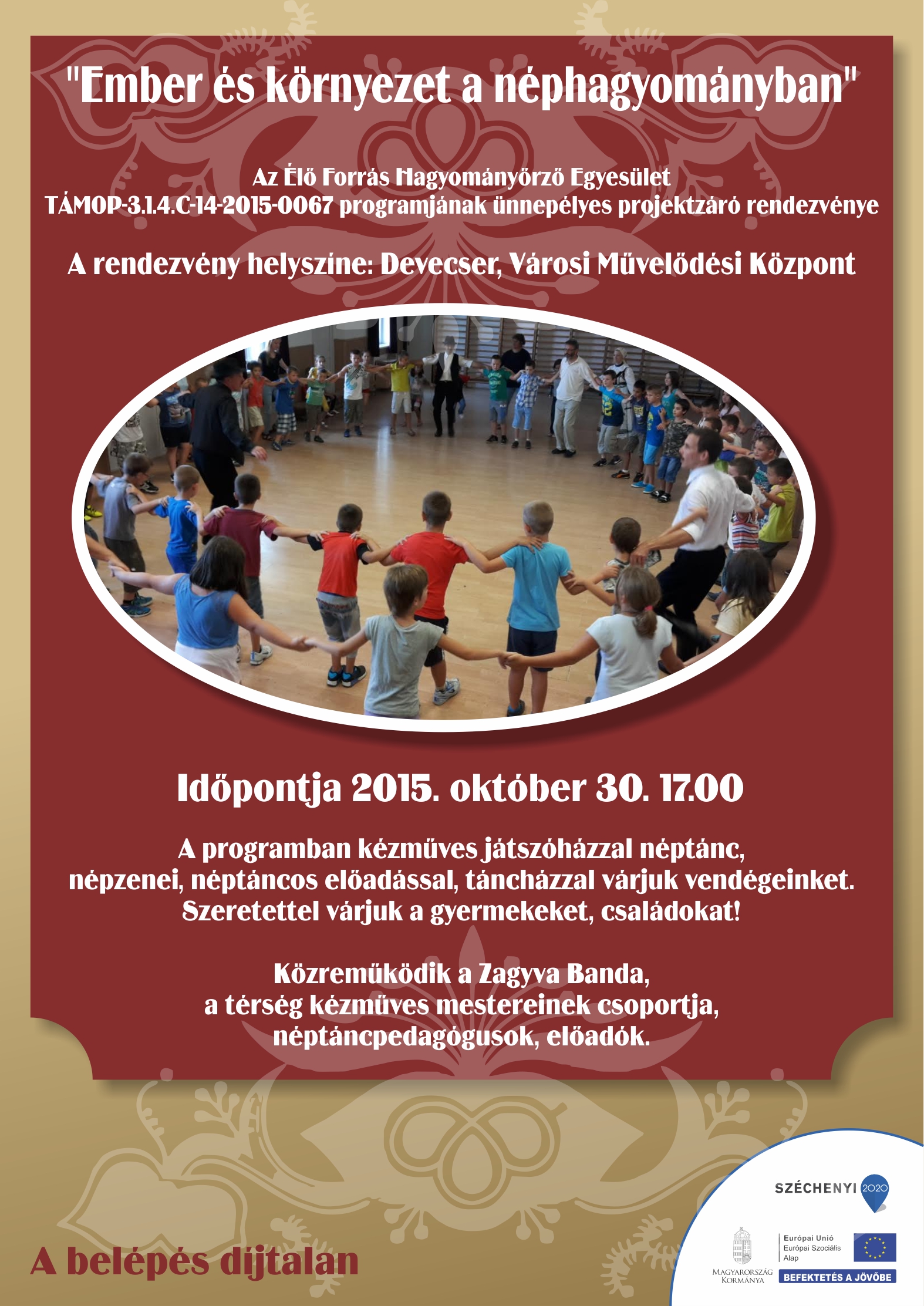 A projekt ünnepélyes záró eseményét 2015.október 30-án, pénteken 17.00-tól tartjuk Devecserben, a Városi Művelődési Központban (Jókai u. 3.). A program rövid köszöntő és értékelő beszédekkel kezdődik, majd táncelőadás, családi játszóházi délután, egészséges ételek kóstolása zajlik.