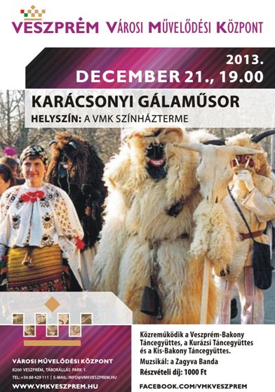 Meghitt, lírai részekkel tűzdelt, mégis sodró erejű, lendületes karácsonyi táncgálát rendezett Veszprém három kiemelkedő táncegyüttese. A Kis-Bakony Táncegyüttes, a Kurázsi Táncegyüttes és a Veszprém Bakony Táncegyüttes tagjainak rokonsága és a néptánc kedvelői zsúfolásig megtöltötték a VMK nézőterét. Az együttesek az Advent népszokásainak bemutatásával tördelték meg a táncok folyamát. A csoportok a régi, kedvelt koreográfiáik mellett új műsorszámokat is bemutattak, ezzel is érdekesebbé téve a műsort.