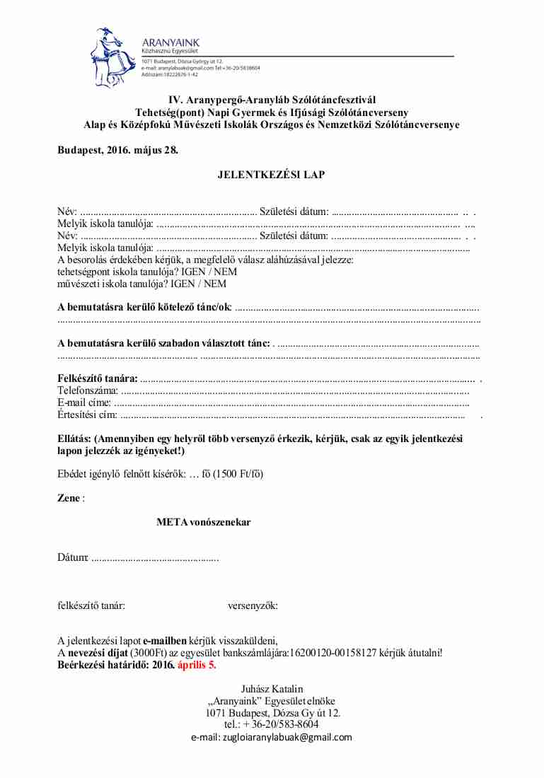 A táncok zenei anyagát április 8. kell egyeztetni Salamon Beával: Ez az e-mail-cím a szpemrobotok elleni védelem alatt áll. Megtekintéséhez engedélyeznie kell a JavaScript használatát.